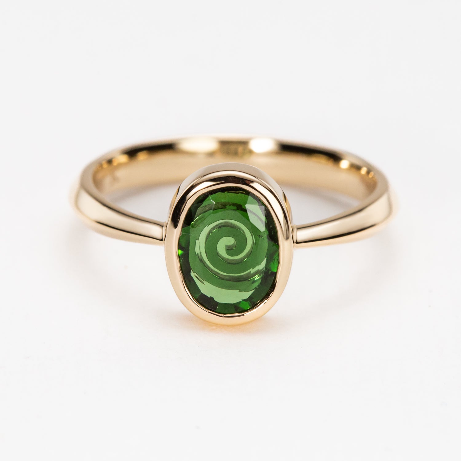 This vivid Green Tourmaline ring holds a stone that opens like a clearing in the forest, revealing a platinum spiral beneath the stone’s clear surface. Inspired by our native ngahere and the unfurling fern frond found throughout Aotearoa, the spiral speaks of renewal, rebirth, and new beginnings. Bezel set in solid 9-carat gold with a platinum spiral detail, this piece is a quiet tribute to the whenua, perfect as a memento of time spent in Aotearoa or a treasure to be held close.
