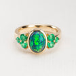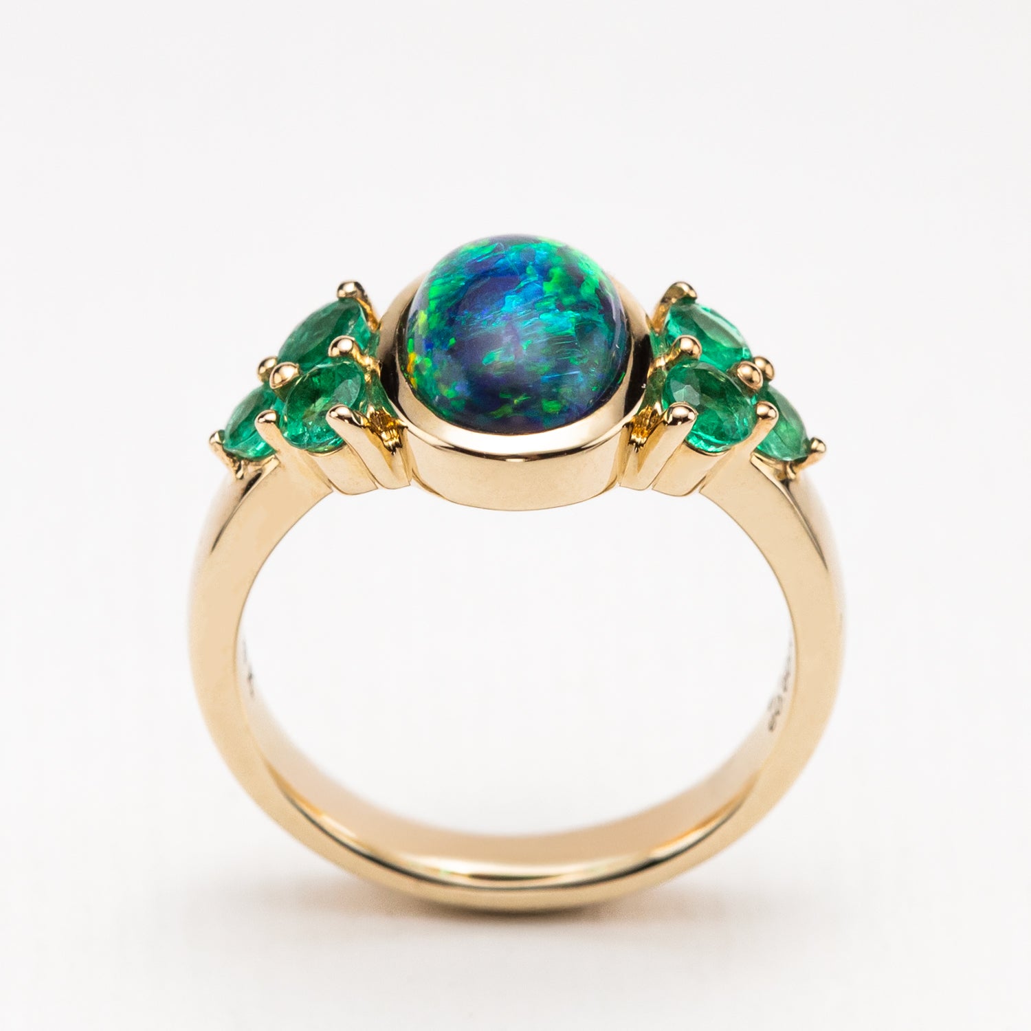 The natural Black Opal is oval-shaped, measuring 9.50mm x 7.00mm x 5.15mm and totals 1.95 carats in weight. The six natural, round-shaped, modified brilliant cut emeralds measure 2.50mm - 3.20mm in diameter, totalling a combined weight of 0.61 carats.