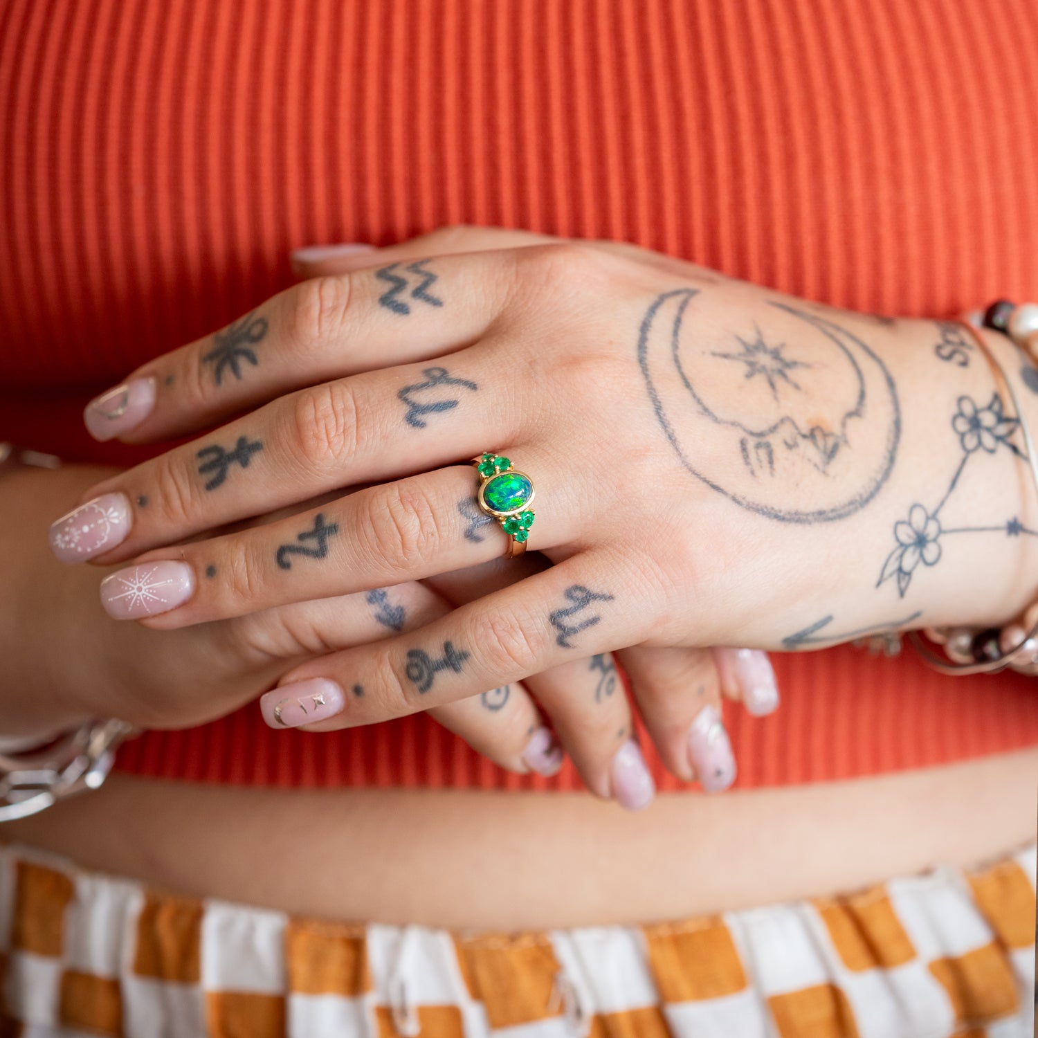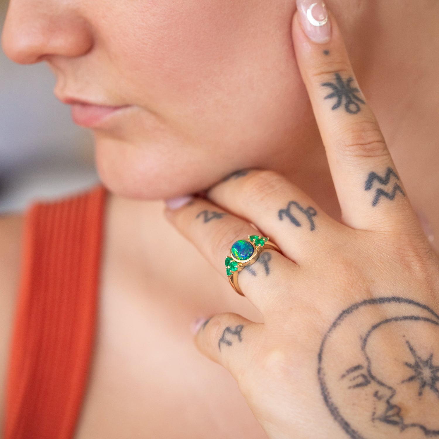 The Emerald City Ring features a bewitchingly beautiful bezel set Black Opal with an alluring deep green-blue flash. This striking stone is framed by vivid Emerald clusters set either side. A magnificently green bouquet style ring, as if gathered from the fields of the Emerald City itself. Wickedly green for good. All crafted in solid 9 carat yellow gold.
