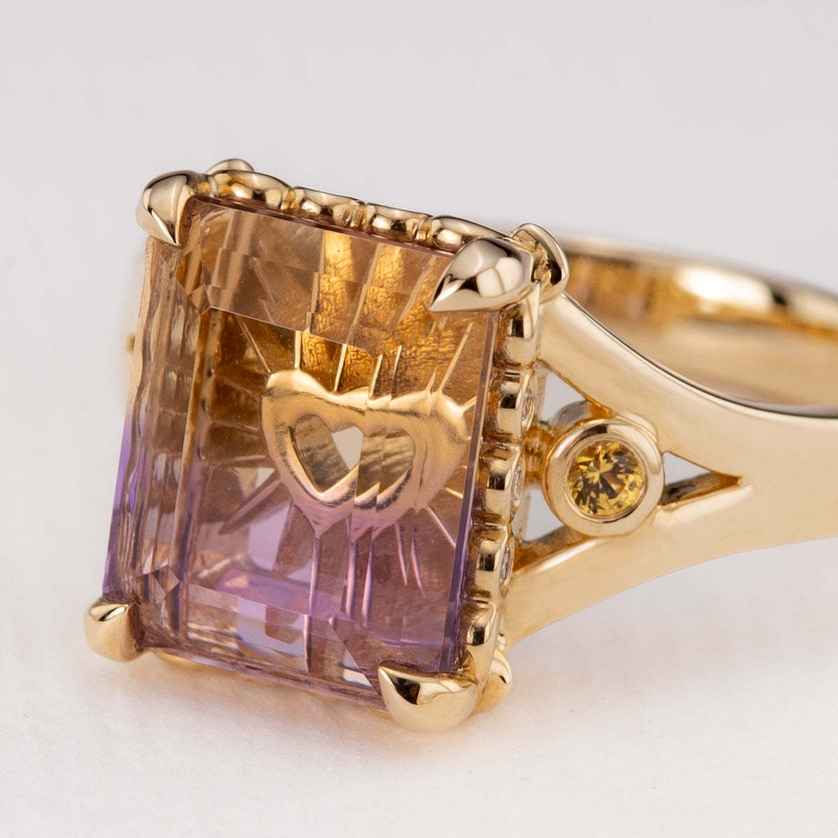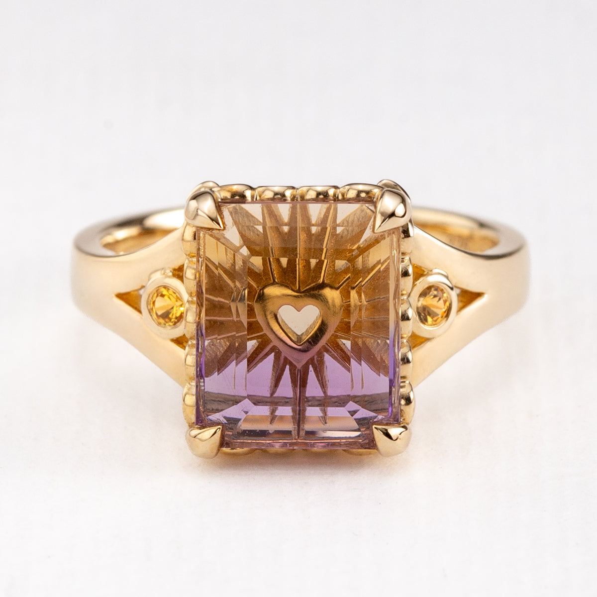 Presenting our Ametrine Radiant Love, captured within a jaw-dropping Ametrine of pristine clarity; a luminous union of Amethyst and Citrine. Seemingly suspended within the stone, a golden heart glows from within, radiating warmth and love. Golden rays extend outward toward the four-claw fleur-de-lis setting, while bezel-set diamonds trace the sides of the centre stone. Delicate yellow Sapphires adorn either side of the split-shank band. A truly unique piece, created as a timeless token for your love story. All set in 9 carat yellow gold.