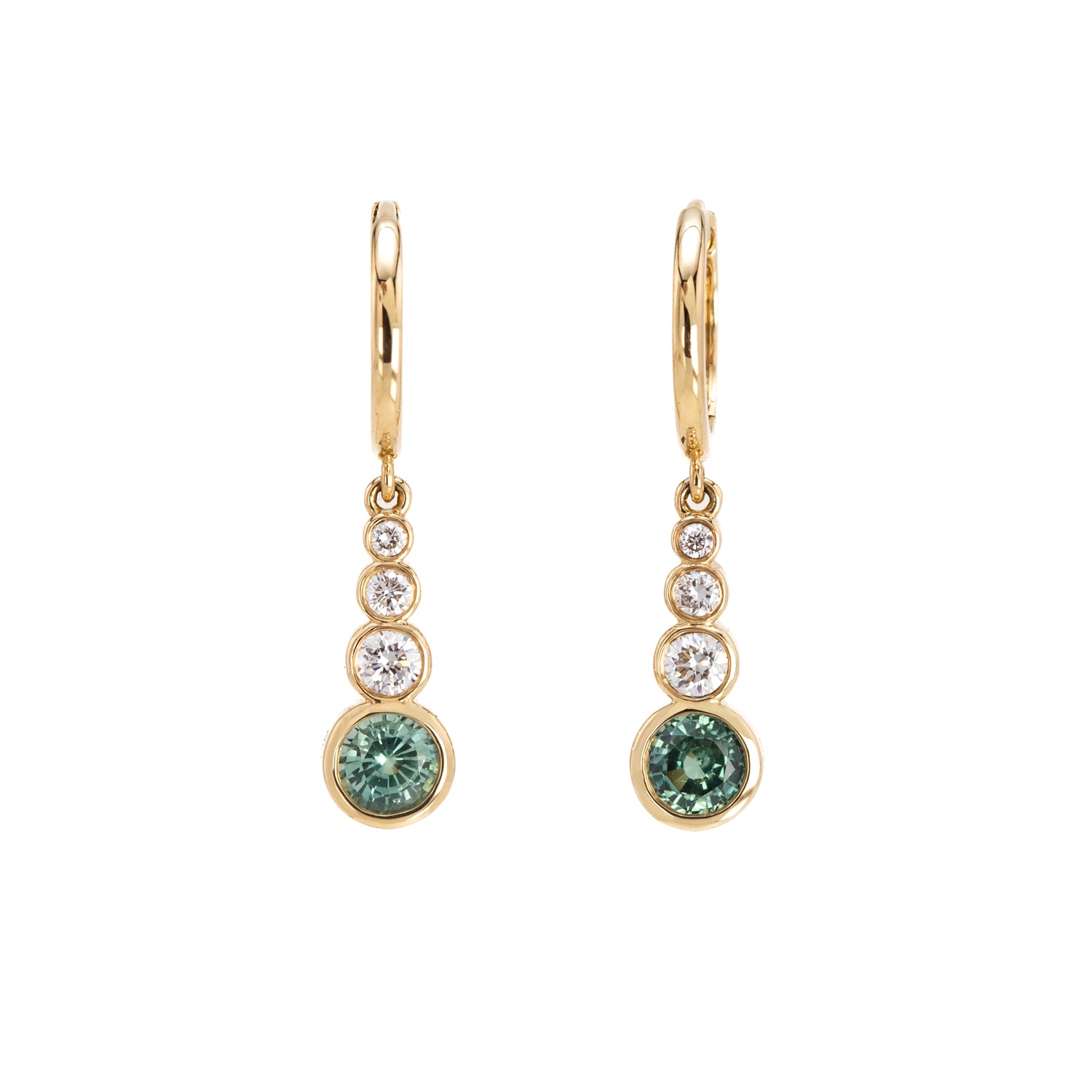 Gorgeous green Sapphire and Diamond earrings, embodies nature and its life force, inspiring growth mindset, offering grounding alignment in life's next phase. All framed in solid 9 carat yellow gold with hinged hoops for comfortability.