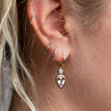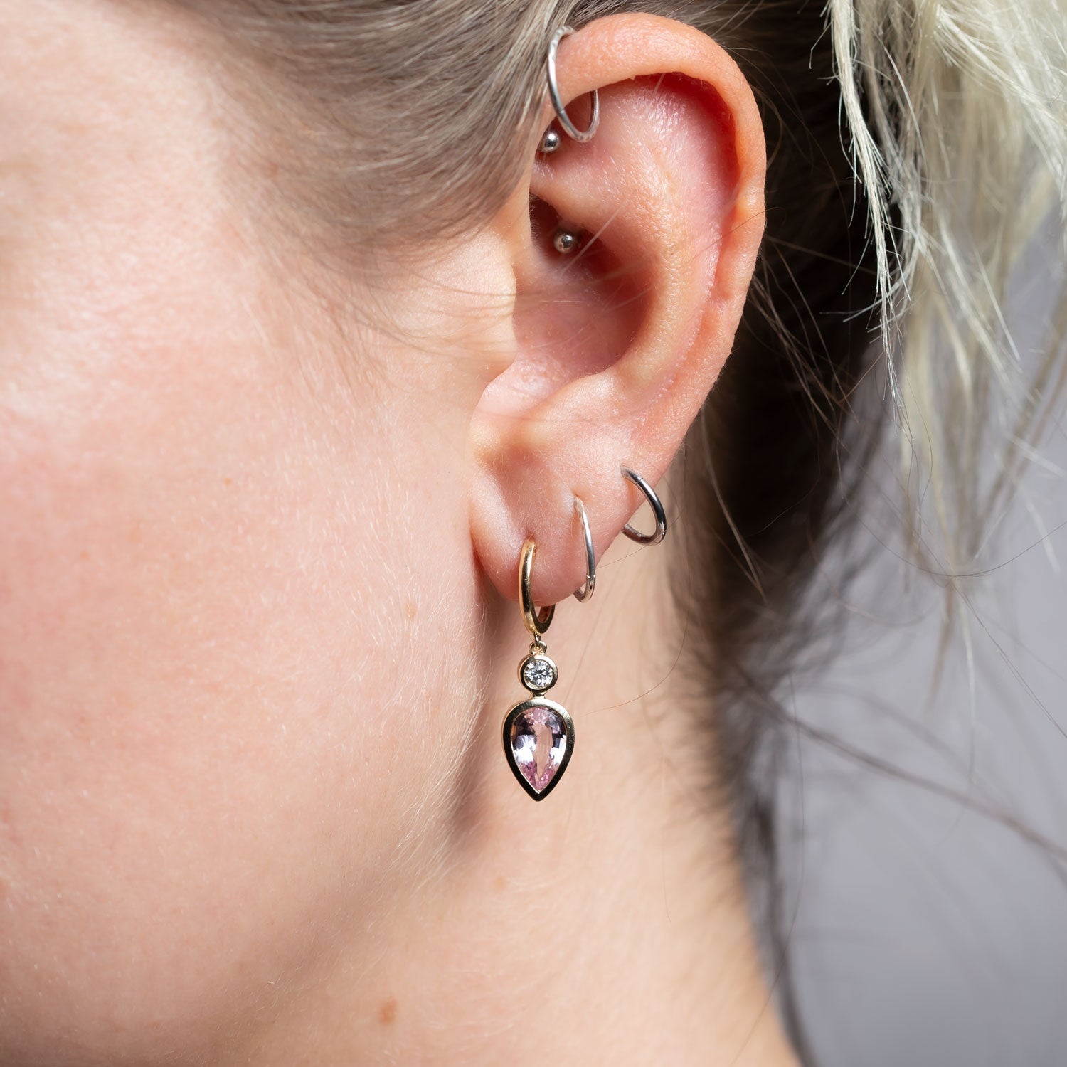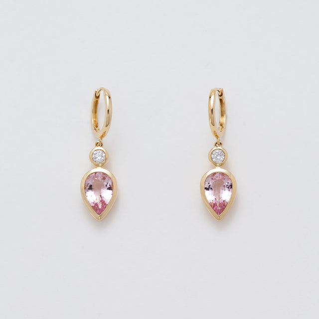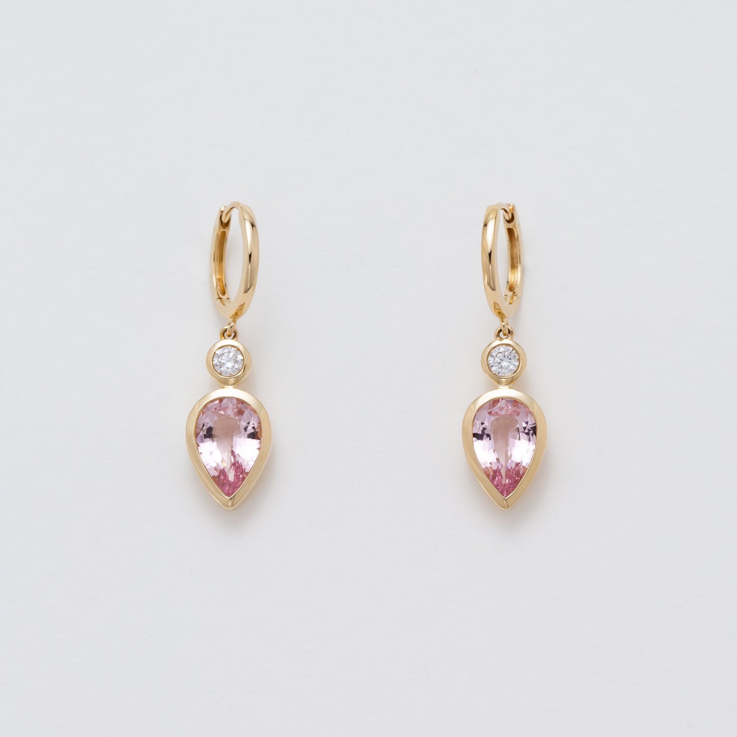 Aphrodite's tears feature brilliant pink Morganites and Diamonds, set in solid 9 carat yellow gold and hung on hinged hoops. Aphrodite's the epitome of feminine allure and charm, influencing romantic relationships, attraction and connection.