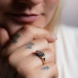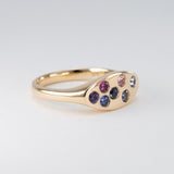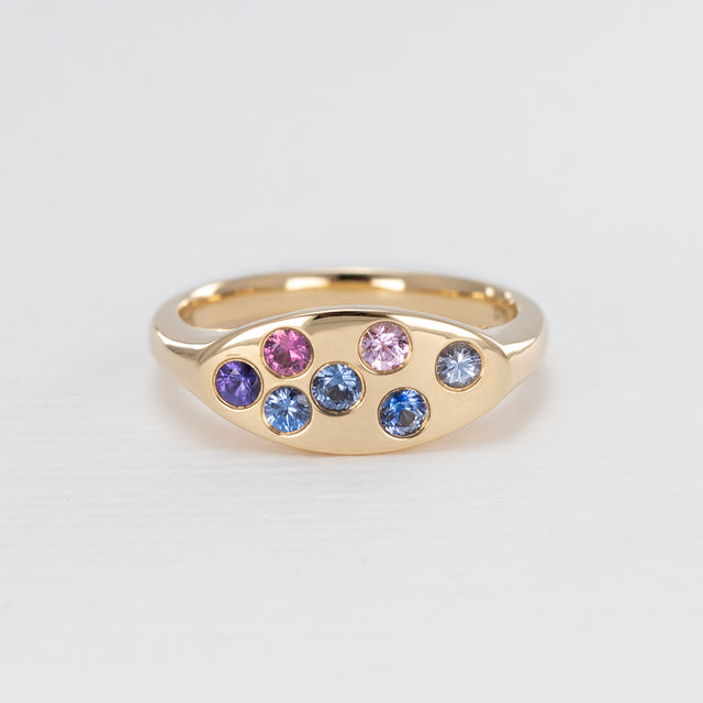 This 9 carat yellow gold ring features a cluster of blueberry coloured Sapphires, embedded into a signet style ring band. A total of 7 brilliant cut Sapphires in a range of pastel pink/purple tones, sprinkled across the oval ring head.