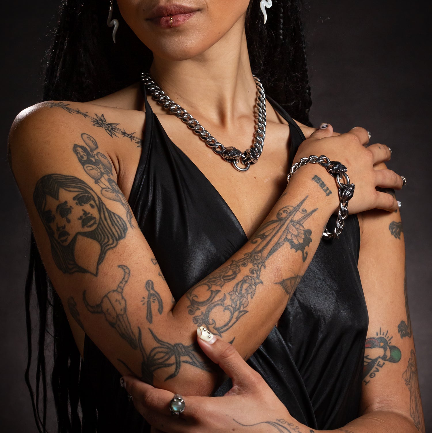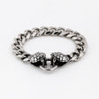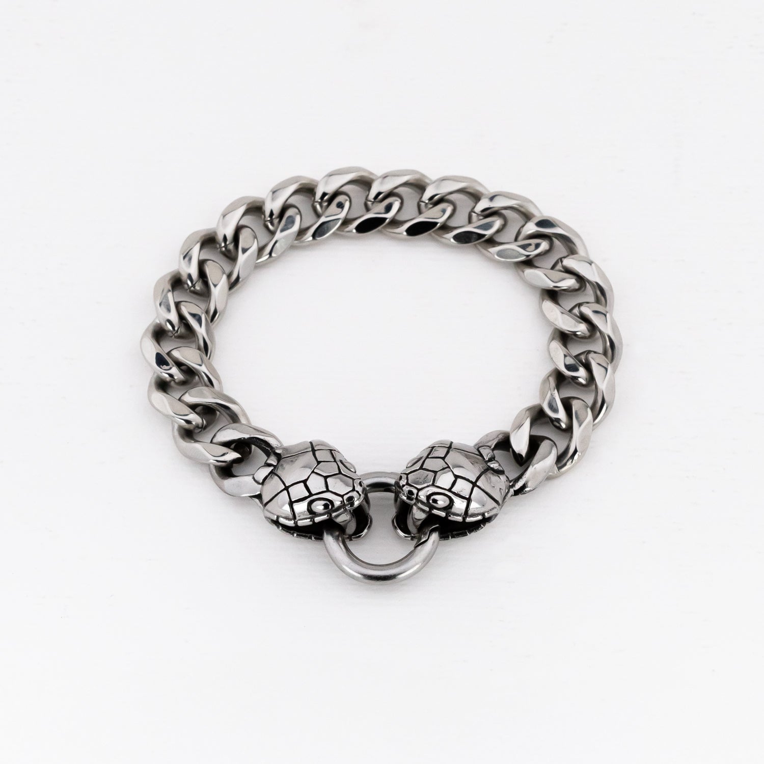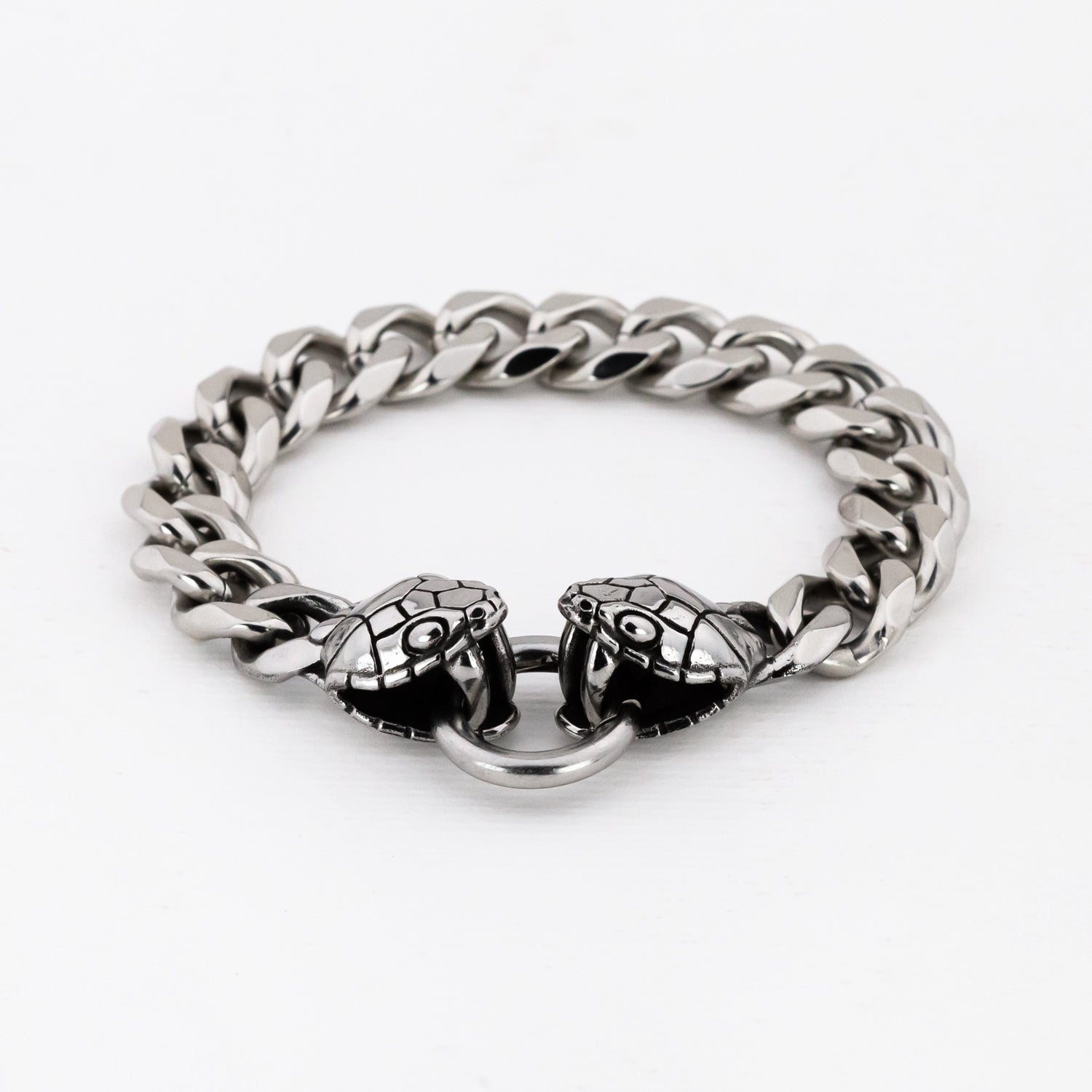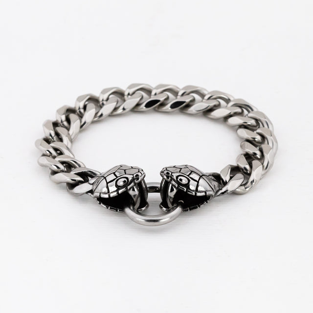 Offered in two sizes, select either 19cm or 21cm lengths from nose to nose of snake heads with a 20mm circular font clasp. The snake heads themselves measure approximately 16mm x 22mm on either end of a cut curb style chain made in solid stainless steel.