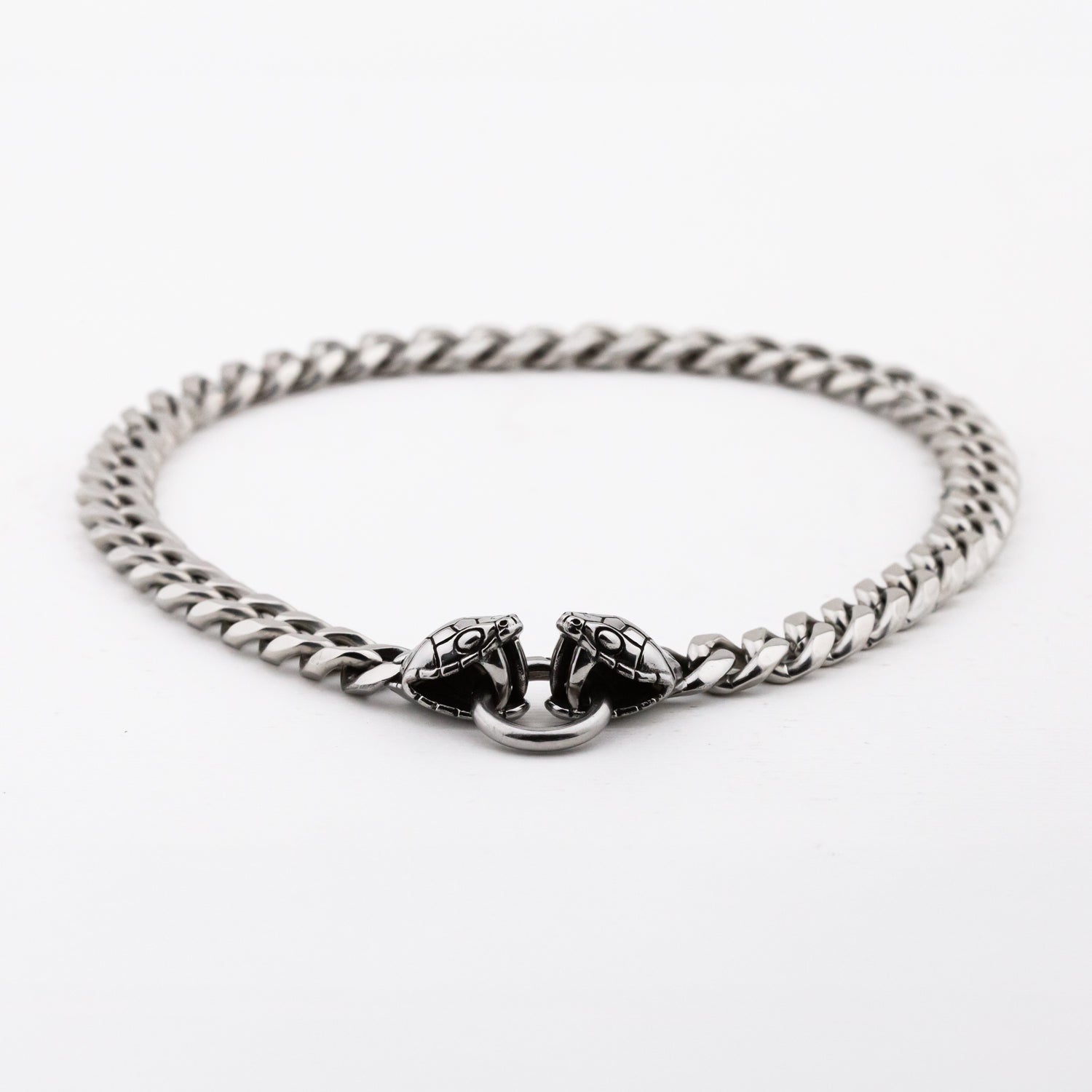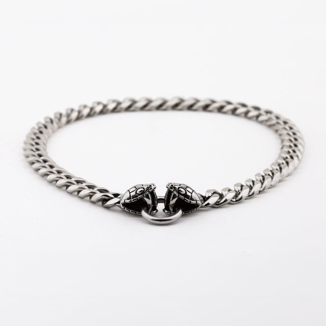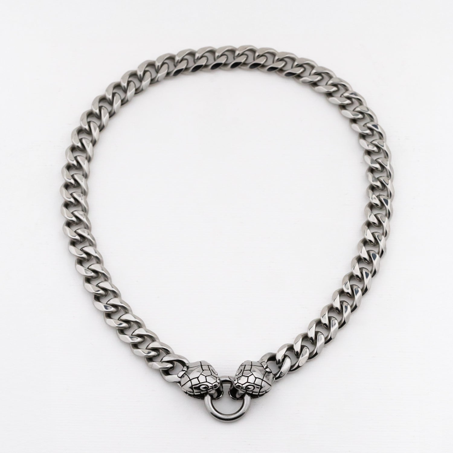 Measures 46cm long from nose to nose of snake heads with a 20mm circular font clasp. Sits like a standard 45cm necklace on the neck. The snake heads themselves measure approximately 16mm x 22mm on either end of a cut curb style chain made in solid stainless steel.
