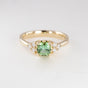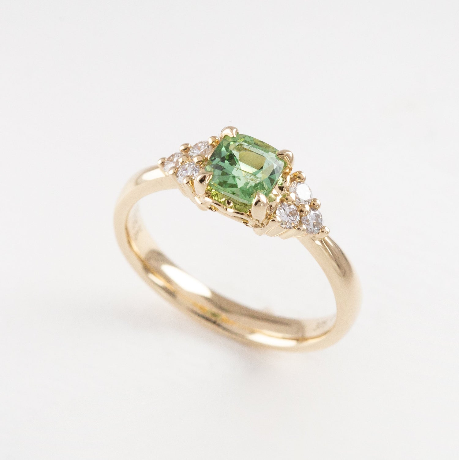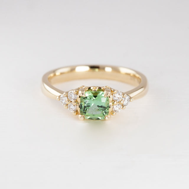 Introducing our Frosted Dahlia ring; at its centre lies a dazzling pastel green Tourmaline. A graceful tribute to growth, harmony, and the beauty of becoming. This natural Tourmaline is held delicately by fleur de lis claws, with clusters of three lab diamonds set either side, adding a shimmer like dewdrops at dawn. All cleverly crafted in 9 carat yellow gold.