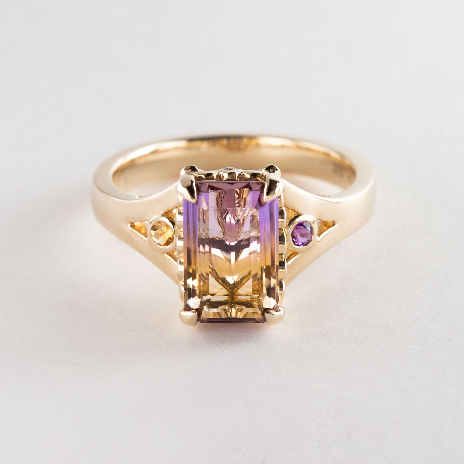 Features a natural octagonal step-cut Ametrine, with bezel set Amethyst and Citrine either side. Gracefully held by fleur de lis claws, and lined by eight dazzling lab diamonds, all bezel set and bordering the centre stone.