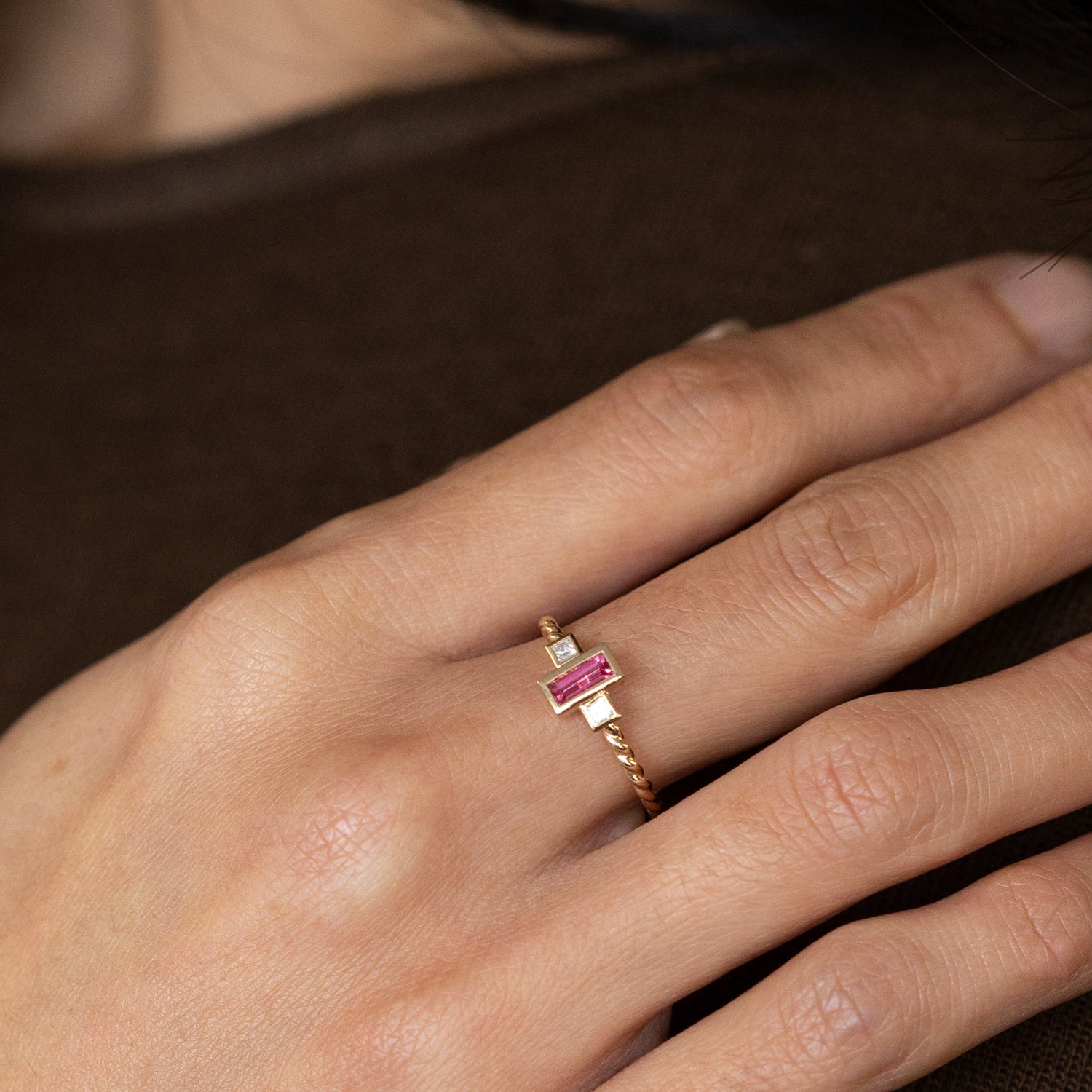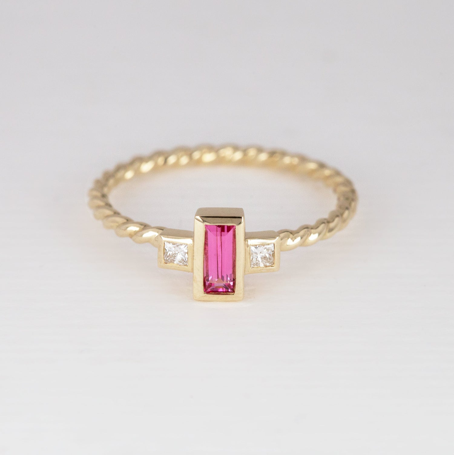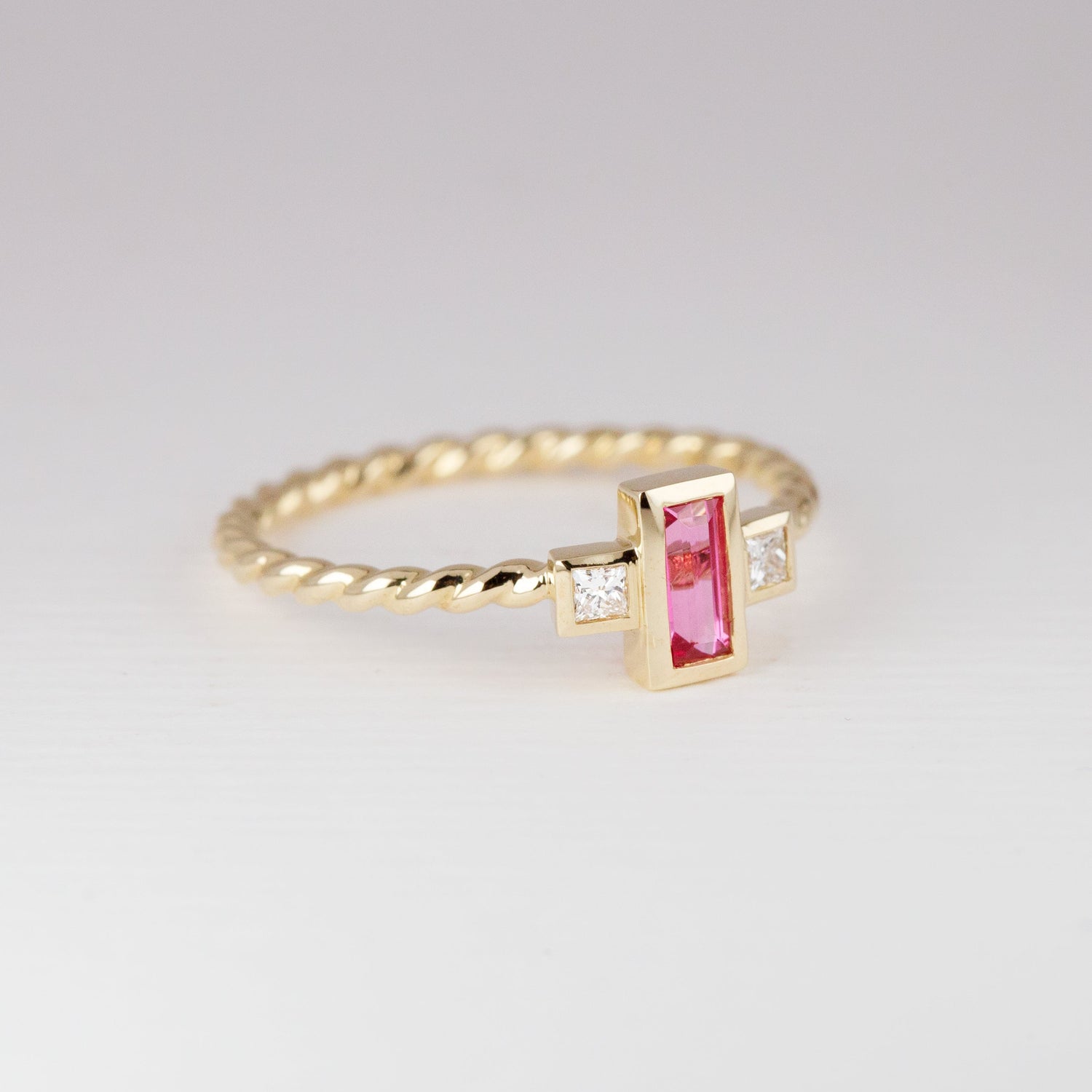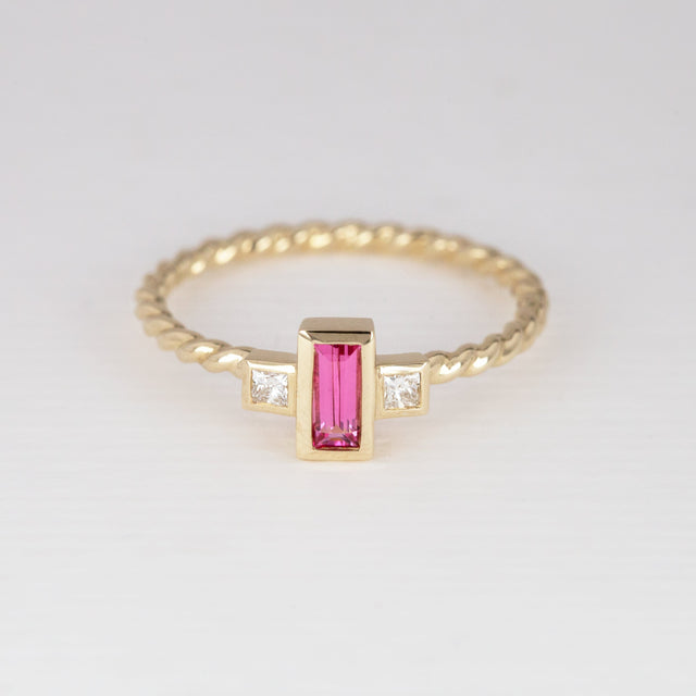 A new Tiny Treasure; with an elegant bezel set Neon Pink Spinel. This new addition to our Tiny Treasure range features a rectangular cut Pink Spinel adorned with two square lab diamonds set either side. All set in 9 carat yellow gold, on a twisted ring band. Featuring a floating setting making the new Tiny Treasures perfectly stackable.