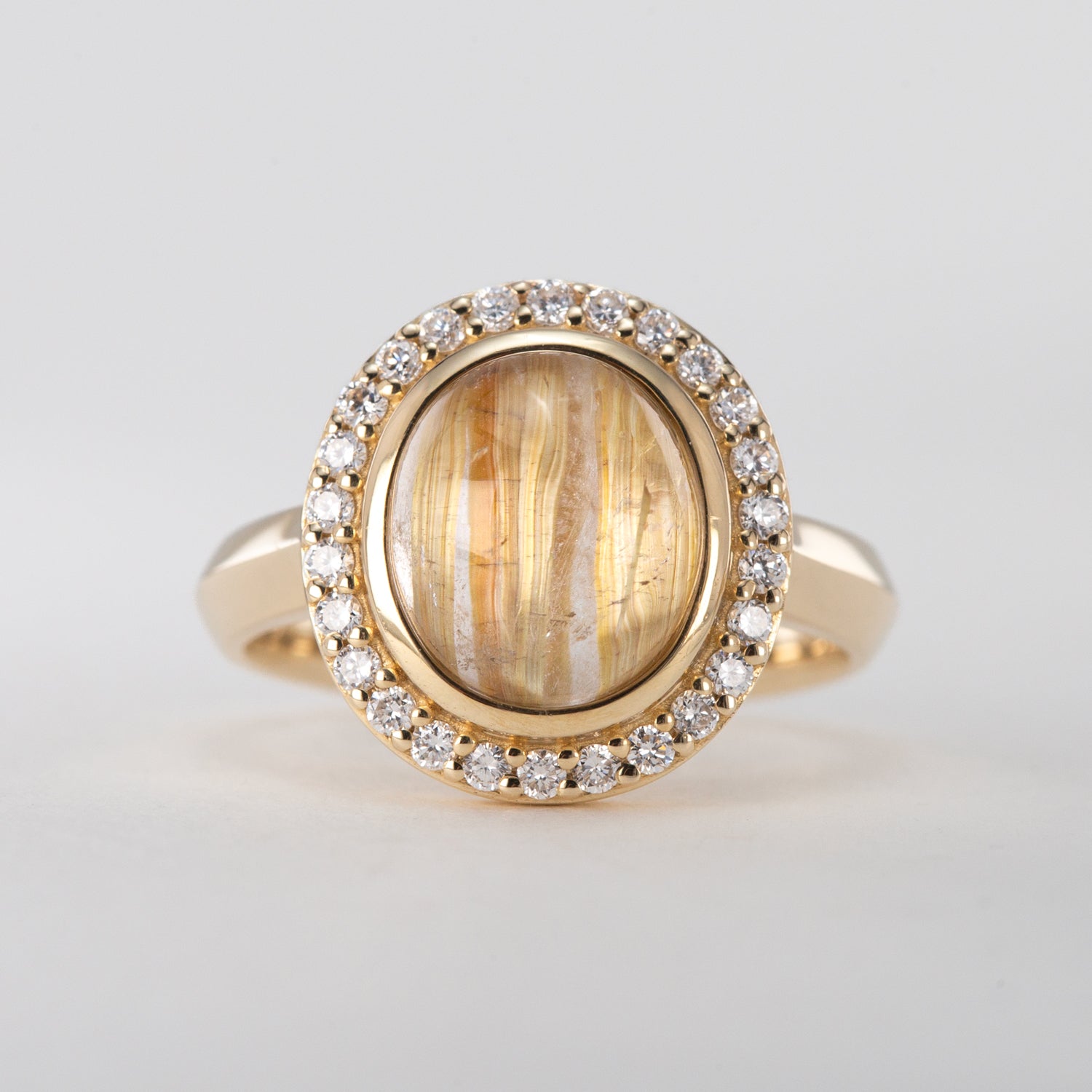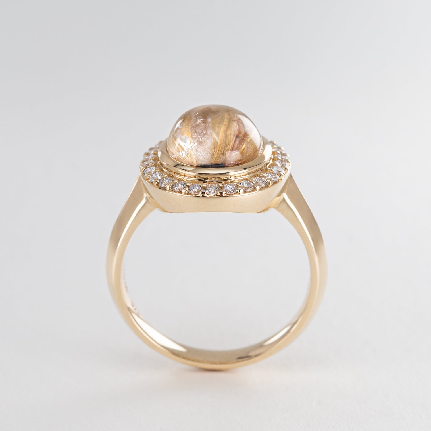 With summer on the horizon, we welcome the Sun Seeker ring. A homage to longer days and golden rays. This natural oval shaped Rutile Quartz cabochon is encircled by 26 brilliant-cut lab diamonds that shimmer like dancing sunlight. A perfect adornment for those who seek the sun, and summer fun. Crafted in solid 9 carat yellow gold.