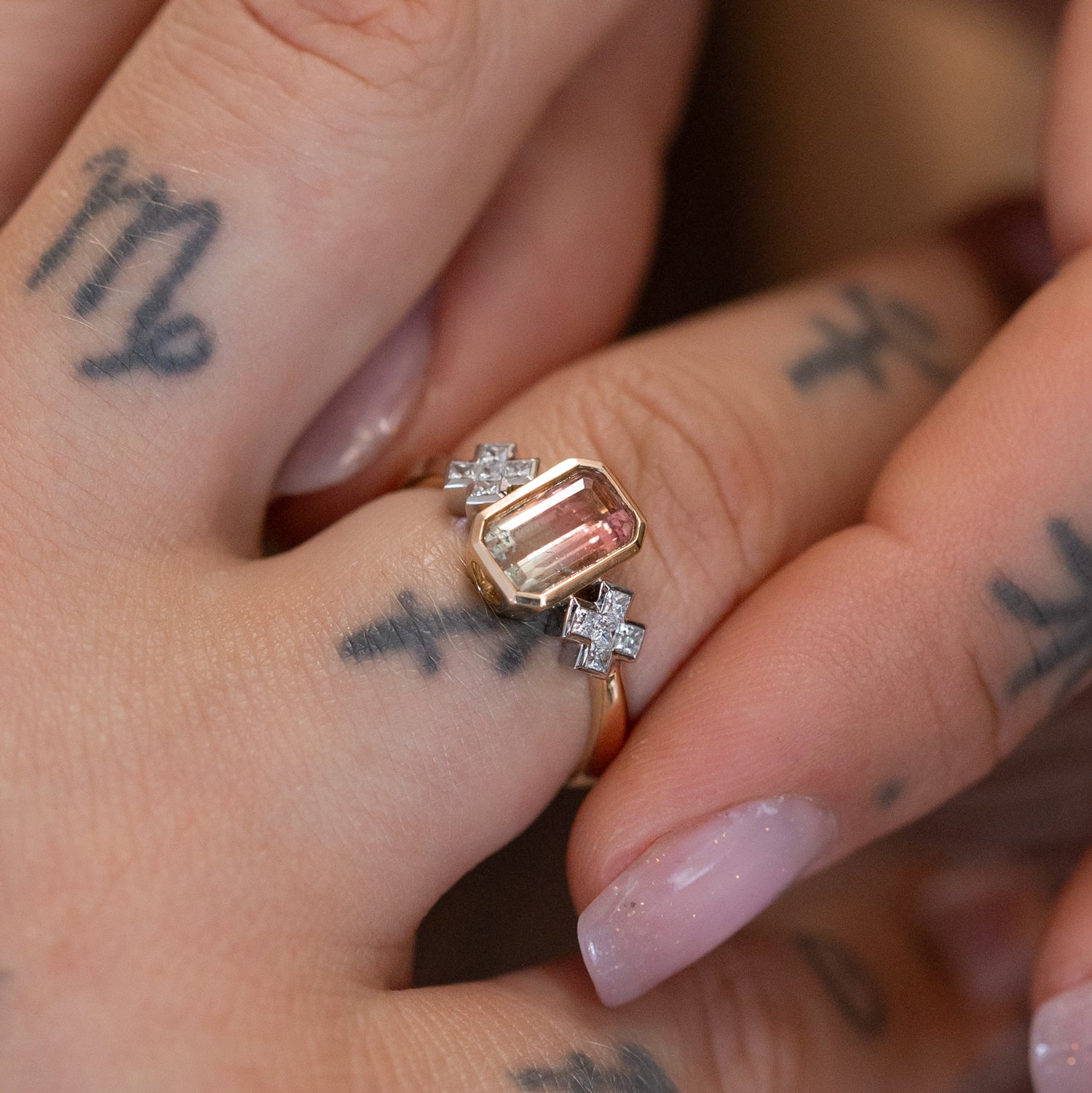 Our latest edition our Kiss Kiss ring; featuring a spectacular Watermelon Tourmaline in a pastel hue. A sweet design symbolising the fleeting moment of a kiss, and the treasure trove of love, life, and intimacy one holds. Accented by ten princess cut lab diamonds, all channel set in 950 platinum, forming our beloved kiss kiss 'xx' design detail. All crafted on a 9 carat yellow gold ring band, embellished by heart shape keyhole details.