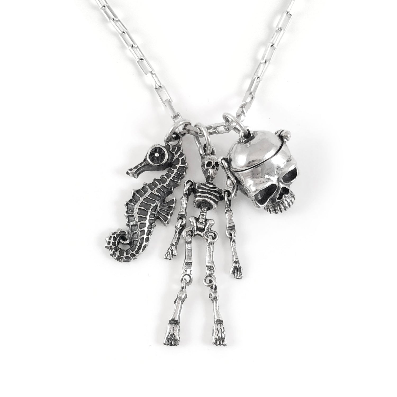 This Pirate Charm set includes; a Sea Horse; a wiggly Skeleton with joints at the shoulders, elbows, hips and knees; and a Skull that opens to reveal a chunk of Pyrite (aka Fools Gold).