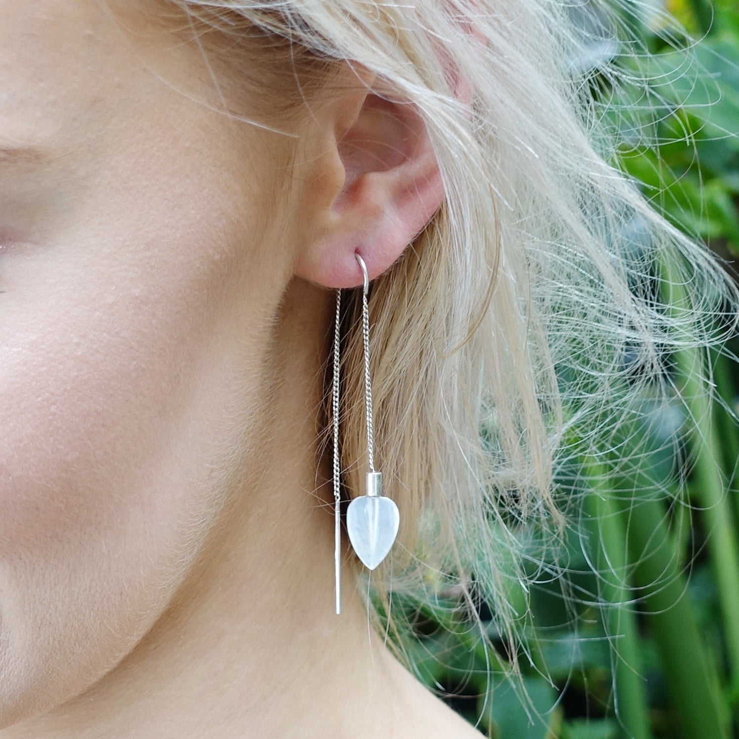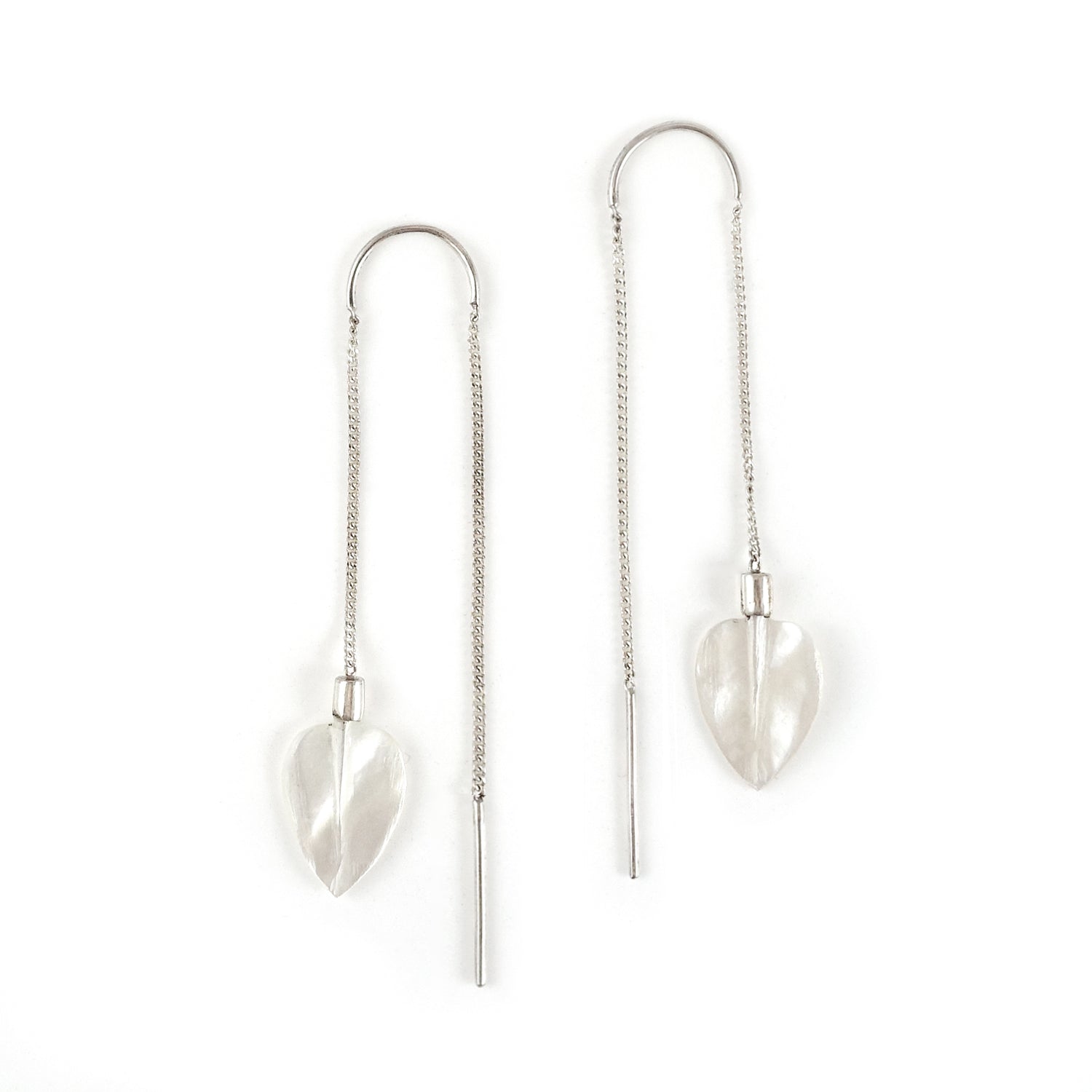 Tiny 1cm heart-shaped leaves carved from Mother of Pearl Shell and hung on sterling silver threads.