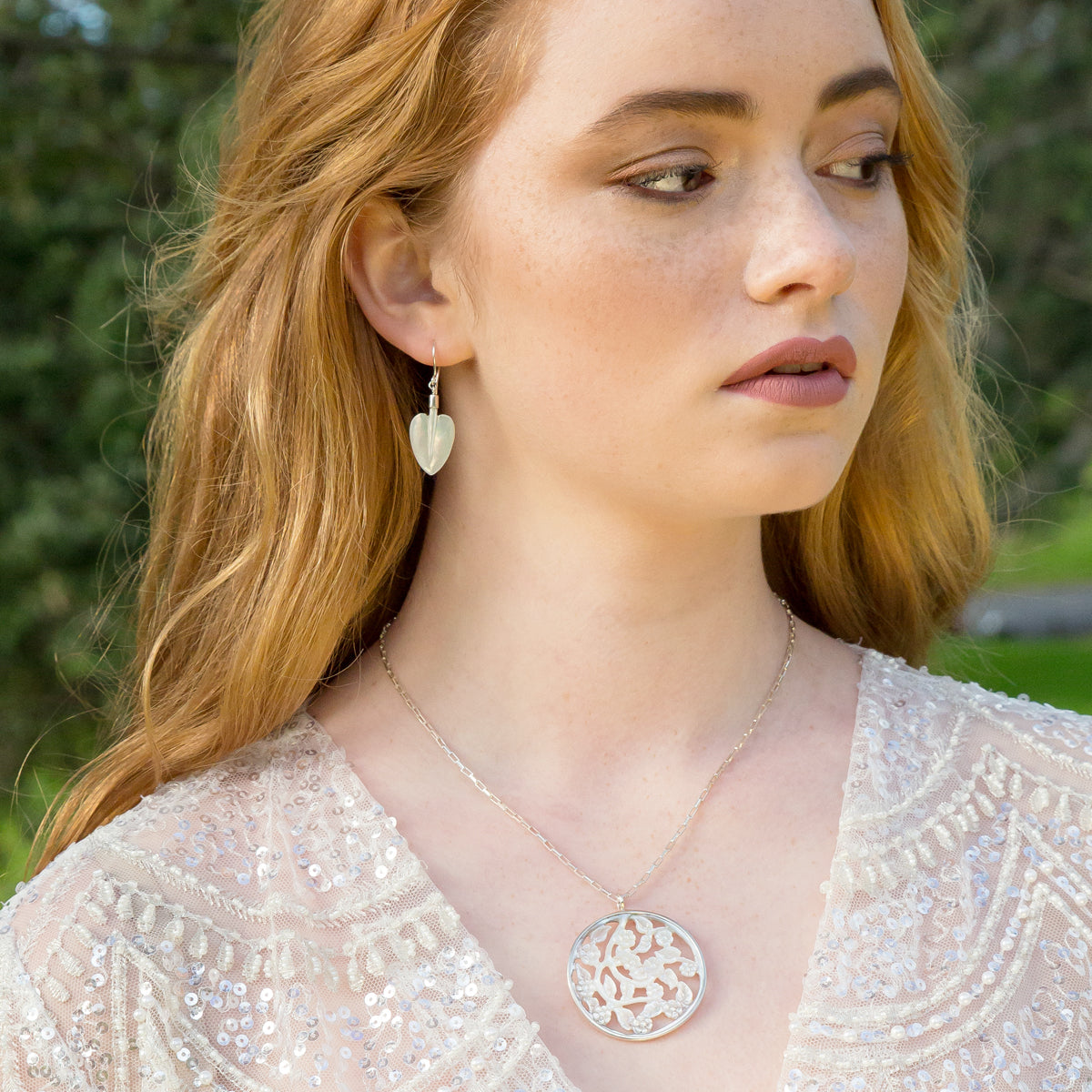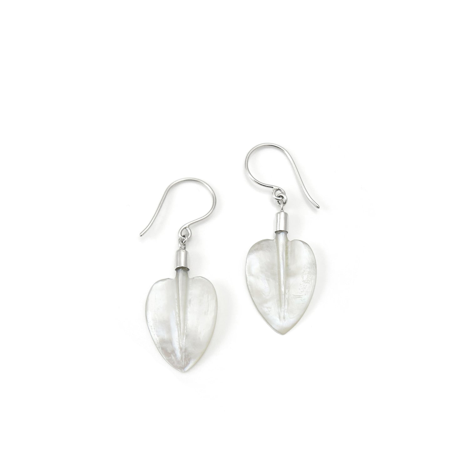 These earrings are inspired by the Pohutukawa leaf, meticulously hand-carved from Mother of Pearl shell and set in sterling silver.