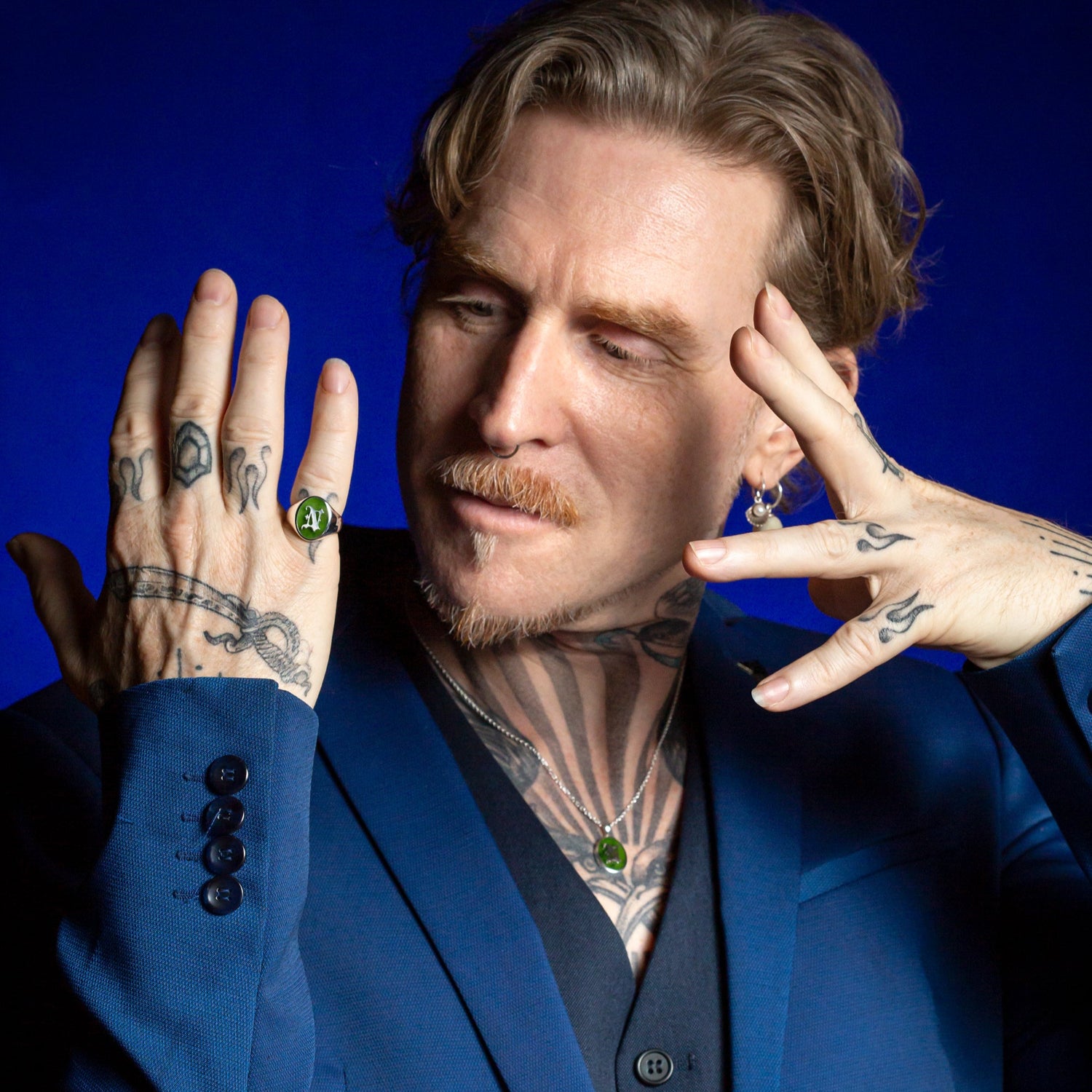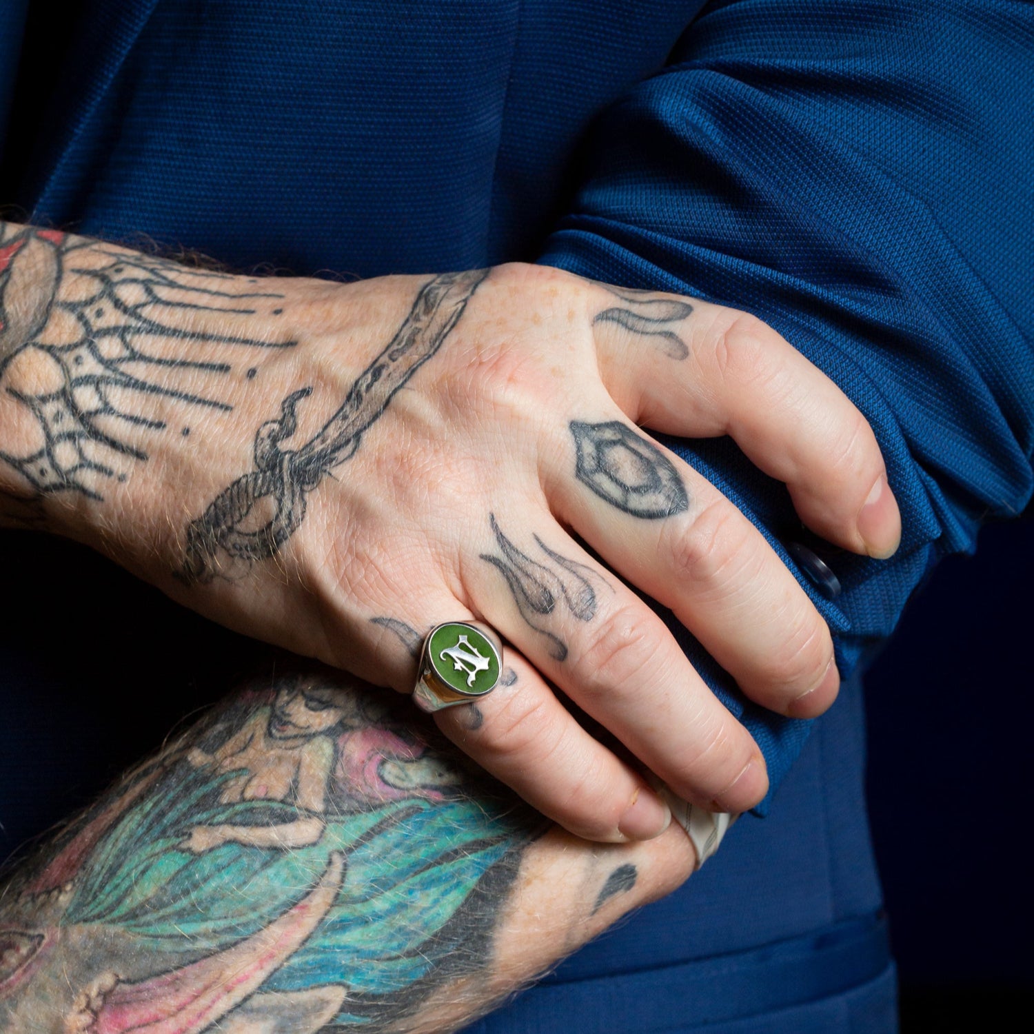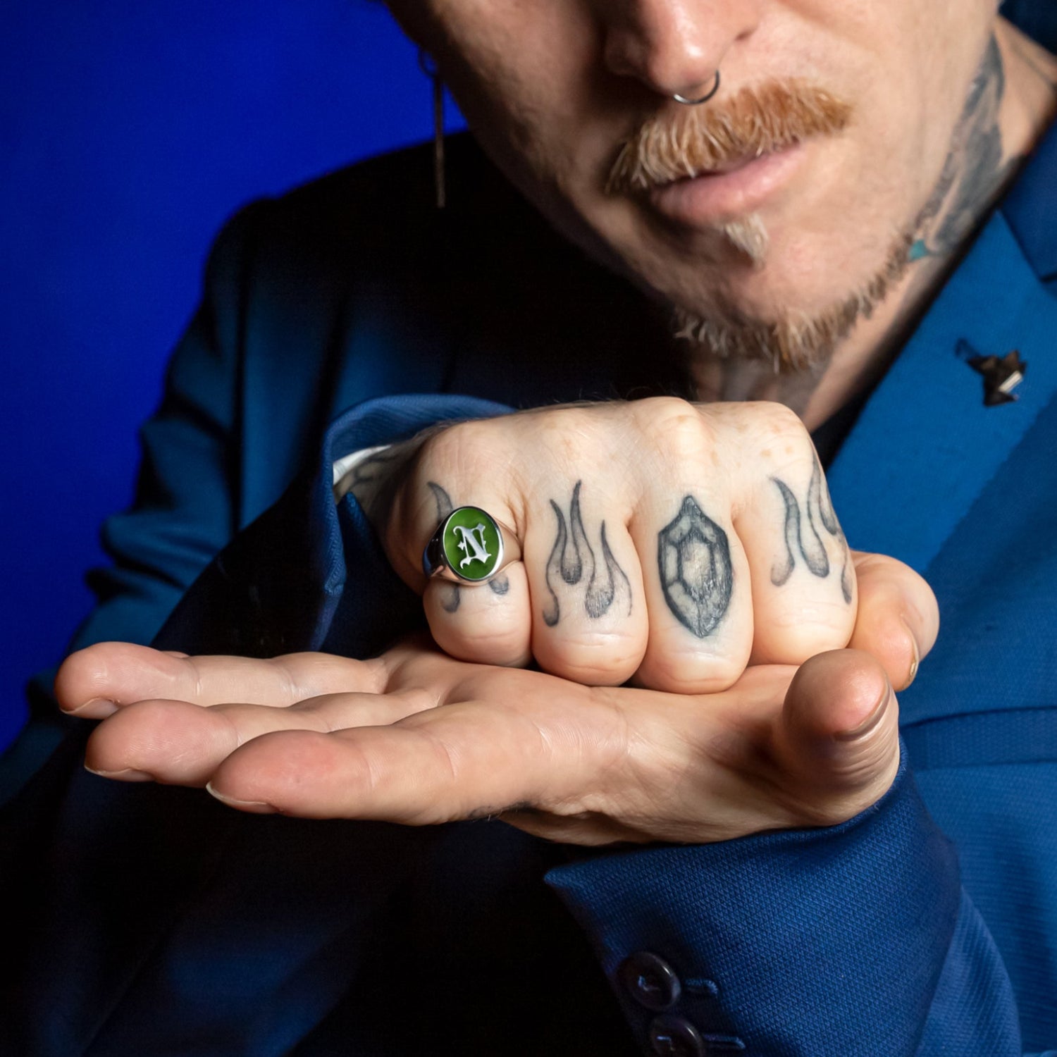 Proudly presenting "This is Me", a personalised ring made of New Zealand Pounamu and sterling silver. It's a true statement piece for those who embrace their individuality and identity without fear or apology. These rings make unique gifts and can be customised with a letter from our exclusive Nick Von K font, inspired by old Gothic styles with a modern twist. There is also an option to engrave up to 20 characters on the inner band, also available in solid 9ct yellow gold.